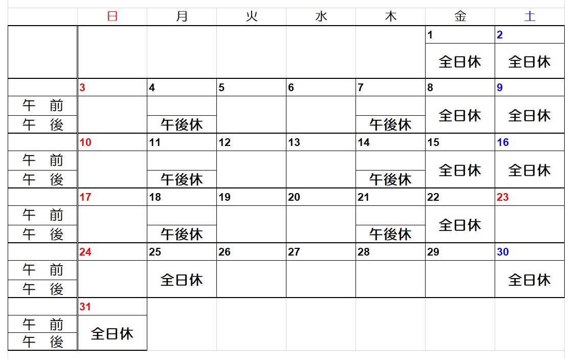 全日休診:1(金),2(土), 8(金),9(土),15(金),16(土),22(金),25(月),30(土),31(日) 午後休診:4(月),7(木),11(月),14(木),18(月),21(木)